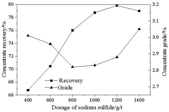 The dosage of vulcanizing agent is also an important factor for the flotation study of copper oxide ore. The experiments were conducted for sodium sulfide dosages of 400, 600, 800, 1000, 1200, and 1400 g/t. Furthermore, the collecting agent dosage was 500 g/t, and the foaming agent’s dosage was 100 g/t. Additionally, the grinding fineness was −0.074 mm accounting for 90%. The experimental results are as shown in Figure 5.