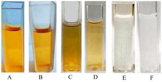 Figure 1. Images of silver nanoparticle (AgNP) solutions produced by (A) process A + 1 mM AgNO3, (B) process A + 2 mM AgNO3, (C) process B + 1 mM AgNO3, (D) process B + 2 mM AgNO3, (E) process C + 1 mM AgNO3 and (F) process C + 2 mM AgNO3.