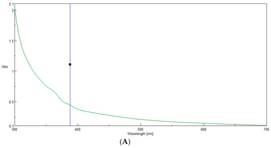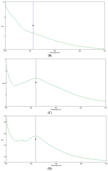 In contrast, the occurrence of intracellular reduction processes in process B was confirmed by the second UV–Vis spectrum (Figure 2B,C). In this experiment, wet biomass was introduced into AgNO3 at two concentrations (1 mM and 2 mM), and the obtained sample was ultrasonicated to break down bacterial cells. Further UV–Vis results of process B are presented in Table 1.