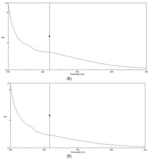 Figure 2. Ultraviolet and visible (UV–Vis) spectra of AgNP solutions produced by (A) process A + 1 mM AgNO3, (B) process A + 2 mM AgNO3, (C) process B + 1 mM AgNO3, (D) process B + 2 mM AgNO3, (E) process C + 1 mM AgNO3 and (F) process C + 2 mM AgNO3.