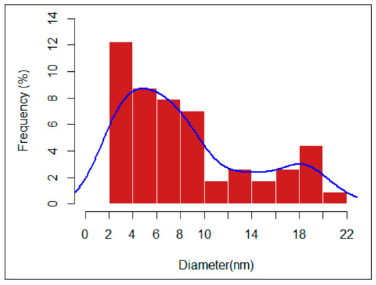 Figure 5. The size distribution of AgNPs produced under incubation in process B with 1 mM AgNO3 and calculated by measuring the diameters of 63 silver nanoparticles in the TEM result.