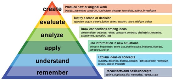 - Anderson, L.W.; David, R.K.; Benjamin, S.B. A Taxonomy for Learning, Teaching, and Assessing: A Revision of Bloom’s Taxonomy of Educational Objectives; Lorin, W., Anderson, D.K., Eds.; Longman: New York, NY, USA, 2001. [Google Scholar]