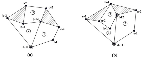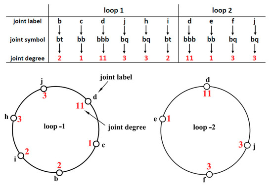 Joint degrees sequence in JDA is usually in a clockwise direction starting from any joint degree. Therefore, the same loop may have more than one JDA depending on the starting joint. For loop (1) in KC shown in Figure 2, JDA can be expressed as [11,1,2,2,3,3] starting from joint “d” or [2,2,3,3,11,1] starting from joint “b”, etc. However, the arrangement of joint degrees inside the array must be unified to ensure that a similar loop must generate the same array.