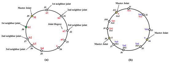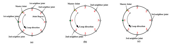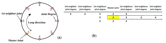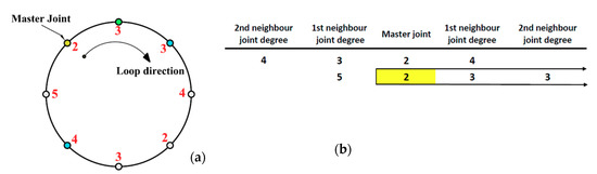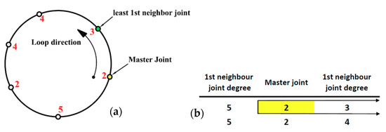 In order to enhance the reliability of the joint degree array, it is important to have a unified loop joint degree array regardless the starting joint. In other words, each loop should have a unique array. A MATLAB code [49] was established to rearrange the elements of the joint degree array to start from a specific joint degree and continue in a specific loop direction. This arrangement depends on the concept of the “master joint” and “neighbor joint”, as described below.