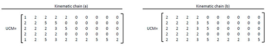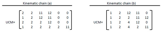 Unified chain matrix for the kinematic chains in Figure 13a,b.