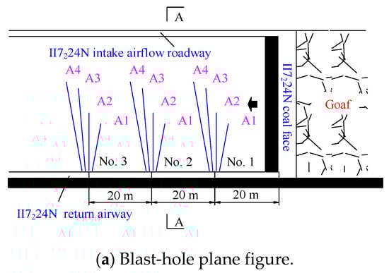 With continuous mining of the coal face, the periodic pressure step distance of the coal face was approximately 22 m. According to the principle that the blasting cycle steps should not be greater than the basic roof caving step distance and that the blasting quantities should be minimized, each group had four blast-holes. The layout of the blast-hole is displayed in Figure 11, where A1, A2, A3, and A4 are the blast-hole numbers. From the first group to the outside, each group had a 20-m blast-hole interval.