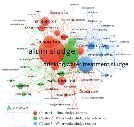 Bibliometric analysis is a useful tool for data analysis. It supplements normal literature reviews to provide an alternative perspective for a literature survey. The most striking feature of bibliometric analysis lies in its knowledge mapping to identify and link key aspects of a certain subject. The performed bibliometric mapping allows for the identification of the most cited items in the literature and the investigation of relationships between the terms obtained [12]. In this paper, a search of the “Web of Science” database using the keywords “waterworks sludge” OR “waterworks residual” OR “alum sludge” OR “water treatment plant sludge” OR “drinking water sludge” was performed, and 516 publications, in scientific journals from 2000 to March of 2021, were obtained.