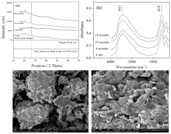 XRD (a) and attenuated total reflection–Fourier transform infrared (b) spectra of Alum sludge (AlS) samples with ageing times and scanning electron microscope images of AlS with magnitude of 5000 (c) and 10,000 (d).