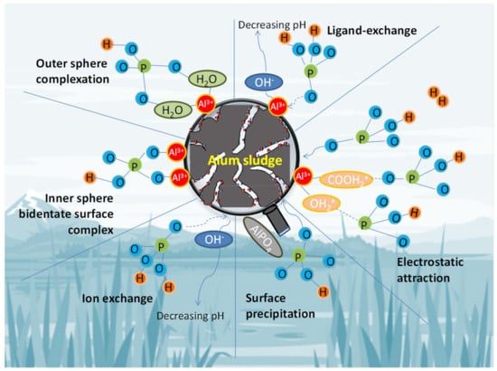 Studies have been conducted to fully characterize AlS through a complete textural characterization and surface chemistry evaluation to identify surface functional groups and also to perform kinetic and equilibrium assays to elucidate the adsorption mechanisms. It has been well demonstrated that AlS has a strong affinity with P, while ligand exchange is the dominant mechanism based on exploratory evidence of the adsorption mechanism of P [29]. The entire adsorption mechanisms include surface precipitation, ligand exchange, electrostatic attraction, inner-sphere bidentate surface complexation, outer-sphere complexation, and ion exchange [2,17,29], which are illustrated in Figure 4. It should be noted that although a chemical reaction between phosphate and dissolved aluminum has been demonstrated, it is believed that the chemical reaction plays only a marginal role in the phosphate removal process [29].