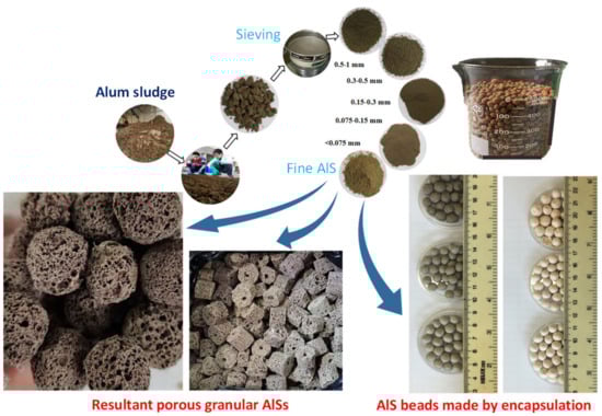 It may be wiser to use AlS as a granular commercial adsorbent for better practical reuse. In recent years, granulation of AlS have been increasingly studied. Granulation is a technique of particle enlargement by agglomeration. It is one of the most significant and commonly used operations in the production of pellet/granular forms from fine or coarse AlS particles, which are converted into large agglomerates [8,57]. These resulting pellets are easy to transport, use, and separate from the adsorption process and are more suitable to be used in wastewater treatment facilities, such as in beds, columns, and filters, due to their increased compressive strength and hydraulic conductivity [58,59]. Therefore, granulation could widen AlS reuse routes and also seems to be a promising strategy to promote widespread engineering application. The current approaches of granulation methodologies are classified into three broad categories: sintering AlS ceramsite [9,60], gel entrapment [61], and newly emerged techniques, e.g., freeze–thaw processes [62] and natural curing [63]. The resultant AlS granulation via encapsulation and sintering can be seen in Figure 6. Shen et al. [64] have produced AlS balls and used them as media in a floating treatment wetland for a comparative study to examine enhanced wastewater treatment behavior. Ren et al. [10] have reviewed the most recent developments in AlS granulation. Undoubtedly, these efforts have successfully demonstrated the potential of AlS as a novel value-added product.
