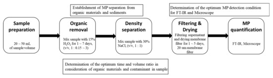Density separation for the MPs in the filtered samples was carried out to optimize MP measurement using FTIR (Figure 1). Each filtered sample (1 L) was mixed in a glass bottle containing 15% hydrogen peroxide (H2O2, 1 L) for 3 d in a laminar-flow hood at room temperature to digest organic matter and to avoid atmospheric contamination of MPs [12]. Subsequently, 1 L of sodium chloride solution (NaCl, 30%) was added to a glass bottle containing the mixed sample with the aim of separating MPs from other particulate matter, such as sediments [13]. The inorganic materials in the samples are usually removed based on density separation using a salt solution. Saturated sodium chloride (NaCl) solution (density: 1.2 kg/L) is commonly used because of its low cost and non-toxicity [14]. The mixture was stirred overnight at 4 °C. The supernatant was then filtered through a 20 μm pore-sized stainless membrane filter (Sungin mesh co, Sus 316 L, pore size, 20 μm, 25 mm in diameter) using a vacuum pump. To remove salt crystals, we put 1 L of MilliQ® ultrapure water into the same filtration apparatus with a vacuum pump. Subsequent filtering was performed using the obtained cellulose membrane filter with the collected MP debris. Following filtration, each membrane filter containing MPs was placed into a glass Petri dish under a laminar-flow hood at room temperature to remove moisture and to avoid atmospheric contamination of the MPs for 7 d. Then, the glass Petri dishes containing membrane filters with MP were wrapped in aluminum foil and stored in a desiccator containing silica gel at 25 °C. From the obtained filters, MPs > 20 μm were quantified and characterized using an FTIR spectrometer Nicolet 6700 (Thermo Fisher Scientific, Waltham, MA, USA) complemented by a Continuum microscope (MCT detector, beam splitter KBr). The band from 4000 to 715 cm−1 was collected, with an applied resolution of 16 cm−1. Each spectrum was an average of 128 scans. Collected data were processed using Omnic software (Thermo Fisher Scientific, USA), and the composition of MP particles was determined by comparing the obtained spectra to a database (Restaurator library, UCT Prague, Praha, Czech Republic), while the match factor threshold was set to 0.80 [14]. For the blank sample analysis to confirm any additional plastic contamination during sample preparation and filtration, blank filters using HPLC-grade water as a sample were prepared and analyzed as a control.