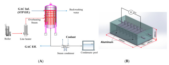 Experimental setup: (A) pilot-scale granule-activated carbon (GAC) unit; (B) lab-scale device for electro-coagulation.