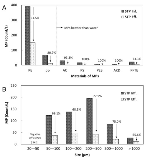 The number concentrations and size distributions of MP particles observed in the influent and effluent of the STP (STP inf. and STP eff.) are displayed in Figure 3A,B, respectively. Seven different MP particles were observed in the untreated sewage sample, including polyethylene (PE), polypropylene (PP), acrylate (AC), polystyrene (PS), polyester (PES), alkyd (AKD), and polytetrafluoroethylene (PTFE). PE was the most abundant MP material class, occupying 72% of the total MP particles, followed by PP (13%), AC (6%), and other polymers with relatively small number fractions (1–4%). The order of the quantity of the MP material class from the sample was assumed to be related to the specific gravity and market share (% of market) of MP raw material. MP particles with a lower specific gravity might be more efficiently delivered with less gravity settling from the source location to the STP through sewer pipes. The specific gravity of each MP particle type were as follows: PE (0.89~0.98 g/cm3), PP (0.83~0.92 g/cm3), AC (1.16~1.20 g/cm3), PS (1.04~1.10), PES (1.24~2.30 g/cm3), AKD (1.24~2.10 g/cm3), and PTFE (2.10~2.30 g/cm3) (Table 1). Here, AKD resins are a segment of a large class of polymers known as polyesters. The market shares of MP classes were as follows: PE (29.5%), PP (18.8%), AC (<1%), PS (7.4%), PES (<1%), AKD (<1%), and PTFE (<1%) [23]. Therefore, specific gravity and market share might be important factors determining the relative abundance of different MP classes in untreated sewage water entering an STP. The materials of the MP particles observed in sewage indicate that MPs were largely originated from daily living supplies, such as personal care products, cosmetics, synthetic cloth washing, packaging films, water bottles and caps, ropes, strapping, paints, utensils, and containers [6,24,25,26,27] The MP particles in the untreated sewage largely varied in their size, ranging from 30.2 to 39,592 µm, with mean and median values of 1051.2 µm and 430.8 µm, respectively (Figure 4B and Table 1).