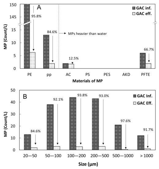 The number concentrations and size distributions of MP particles observed in the influent and effluent of the pilot-scale GAC unit are displayed in Figure 4A,B, respectively. By GAC treatment, significant additional MP removal was achieved (92.9%). Particularly, GAC treatment was found to be advantageous in removing MPs lighter than water, such as PE and PP as well as MPs in all size ranges, including the 20–50 µm sized MPs, which were rarely removed by the primary and biological treatment. With regard to MP removal efficiency, similar results were obtained for the DWTP (drinking water treatment plant) equipped with the GAC filtration system (88% cumulative removal) [30]. Considering the size distribution and material classes of 20–50 µm sized MPs in oceans and effluent of STPs, the majority (64%) of MP particles detected from the Atlantic Ocean were under 40 μm and 70% of MP particles in the STP effluent were in the range of 20–100 μm. Moreover, the most abundant MPs in both ocean and STP eff. were PE and PP [9,20,22]. However, the removal efficiency of the MPs in the smallest size range (20–50 µm; 84.6%) was slightly lower than those of the MPs in the larger size ranges (91.7–97.6%). As shown in Table 1, the mean and median MP sizes decreased after GAC treatment because the MP removal increased as the MP size increased up to 1000 µm. The ANOVA test (Figure 5) showed a significant decrease in the average size across all MP classes after GAC treatment as compared with the MPs in the untreated sewage (p < 0.01 between STP influent and GAC effluent), although the differences in the MP size between two consecutive treatment stages (e.g., STP influent vs. STP effluent and GAC influent vs. GAC effluent) were statistically less significant. Interestingly, the mean and median sizes of PE and PP particles increased after GAC treatment because of the smaller removal efficiency of the larger PE or PP particles in the GAC unit. The lower removal efficiency of larger MPs lighter than water might be attributed to the buoyant force of the particles, which can probably reduce the bulk and internal diffusion into the GAC. Pivokonský et al. (2020) and Wang et al. (year) reported that 73.7–98.5% of MPs removed by GAC filtration had particles ranging from 1 to 5 μm in size, and GAC filtration exhibited a high removal efficiency for MPs with different compositions; the removal efficiency of PE was 72.9–86.2%, followed by PP (around 59.4–66.8%) and polyacrylamide (PAM, around 49.0–54.6%), all of which were similar to the results of lower removal efficiency of the larger MPs [30,31]. Their results indicated that the reduction of small-size MPs was mainly responsible for the removal of MPs in GAC filtration.