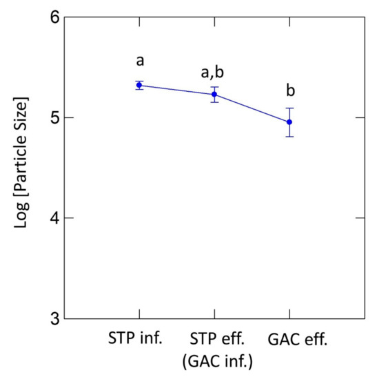 To evaluate the significant differences (* p < 0.05, ** p < 0.01) in the MPs between different treatment stages (STP inf., STP eff., and GAC eff.), one-way analysis of variance (one-way ANOVA) was performed with the Fisher’s least significant difference post hoc test. The ANOVA test was performed on the log-transformed MP size data after the log-normality of the MP size data was confirmed using the Kolmogorov–Smirnov normality test. For all statistical analyses, we used SYSTAT 12 statistics software (Chicago, IL, USA).