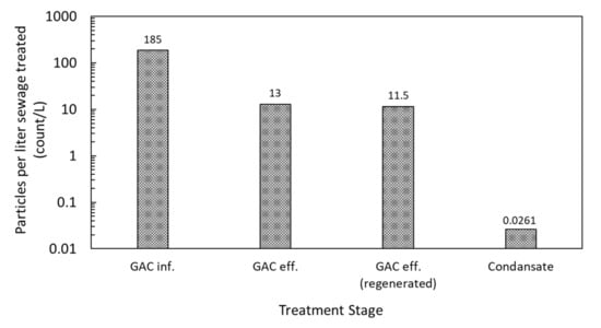 Figure 6 compares the MP removal performance of the virgin and regenerated GACs. The performance of the regenerated GAC was comparable with or even better than that of the virgin GAC. The removal efficiencies of MP particles were 92.9% and 93.8% for the virgin and regenerated GACs, respectively. Thermal regeneration is known to be effective in gasifying the organics adsorbed on GAC, recovering the adsorption capacity [32]. In addition, thermal regeneration with steam was reported to be more effective at regenerating micropore volume compared with that of nitrogen, and therefore adsorbing larger molecular size compounds [33]. Thus, the thermal regeneration with steam used in this study presumably had a negligible effect in deteriorating the GAC adsorption capacity for MP particles that were greater than 20 µm. The number concentrations of MPs in GAC inf., GAC, eff., and condensate are compared in Figure 6. The number concentration was 185 MP particles/L, 13 MP particles/L, and 0.023 MP particles/L for GAC inf., GAC, eff., and condensate, respectively, which indicates that the MP particles captured by GAC were effectively decomposed by the pyrolysis process containing steam (600 °C) during the GAC regeneration step. Here, the condensate was water discharged from the GAC after thermal regeneration, such as pyrolysis. Previous studies on the pyrolysis of plastics contained in STP sludge reported that many polymers, such as PE, PP, PS, and PA, started to decompose at 375–500 °C [11,34]. However, it should be noted that there is no other study in the literature using GAC thermal regeneration for the removal of MPs. The results of the current study suggest the effectiveness of the GAC with thermal generation as a plausible method for permanently removing MPs from STPs, which otherwise can enter the geo-environmental cycle. However, an investigation of the performance evolution with repeated operation–regeneration cycles and of the lifespan and long-term performance of the GAC remains for future studies to estimate.