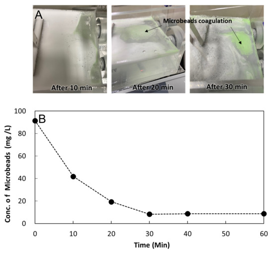 The significant size reduction in the GAC-treated MPs suggests the need to enhance the removal of smaller MPs that are more stable in water [29]. In addition, GAC adsorption of MPs lighter than water was less efficient than that of MPs heavier than water. Thus, a preliminary electrocoagulation experiment was conducted to examine its potential use as an effective pretreatment method for enhancing the removal of smaller and lighter MPs in the subsequent GAC unit. From the electrocoagulation experiment, coagulation of the microbeads gradually developed and was visually observed as the time elapsed (light green color in Figure 7A). With regard to Al-based salts in the presence of MPs, the smaller the MP particle size, the higher the removal efficiency, ionic strength, and concentration of natural organic matter (NOM), while the turbidity level had little influence on the removal efficiency of MP particles [35]. The water separability of coagulated MPs was tested using mild centrifugation at 160× g for 5 min, and the results are shown in Figure 7B. After 30 min of electrocoagulation, inseparable MPs decreased by 90% with little change thereafter, indicating that the flocculation mechanism predominates between 0 and 30 min. These results suggest that electrocoagulation can be effective in increasing the size and density of MPs, which can be easily removed in the following GAC adsorption process.