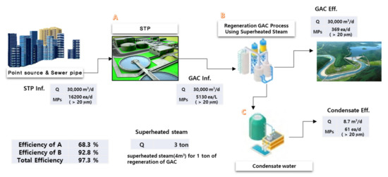 In an STP, MP particles may be resistant to the degradation process that occurs in biological treatment systems and could be part of the chemical that is returned to the environment. For the suggested sewage treatment system in this study, MPs may be discharged as a component of waste sludge from biological processes and volatile components of pyrolysis from GAC thermal generation. Based on the experimental results of the GAC adsorption, the mass balances of MPs in the suggested STP system consisting of primary settling, biological treatment, and GAC adsorption with thermal regeneration were calculated using the MP particles of STP inf., GAC inf., GAC eff., condensate effluent, and corresponding flow data (Figure 8, Table 2). For an STP treating 30,000 m3/d, the total number of MP particles in the STP inf., GAC inf., GAC eff., and condensate effluent were estimated to be 16,200 MP particles/d, 5130 MP particles/d, 369 MP particles/d, and 61 MP particles/d, respectively. Considering the MP particles removed by pyrolysis of GAC thermal regeneration with a removal efficiency of 92.8%, it was estimated that 4700 MP particles/d could be volatilized or converted into other sizes and materials of MPs. Moreover, MP particles generated from the condensate water during the regeneration process, a total of 61 MP particles/d, are predicted to enter the regeneration GAC process, which is a substantial reduction compared with the one from the conventional primary and biological treatment (5130 MP particles/d). In contrast, 11,070 MP particles/d were expected to be discharged to the environment through sludge disposal. The results indicate that the GAC thermal regeneration system could efficiently reduce MPs from the STP retrofitted with the GAC treatment process. Although existing studies on the removal of MPs from the GAC thermal regeneration system are rare, pyrolysis similar to GAC thermal regeneration systems is recognized as a promising sludge treatment technology for removing MPs in an STP [11]. For the removal of MPs in an STP, the major advantages of the GAC thermal regeneration system include the mechanism of filtering and pyrolysis.