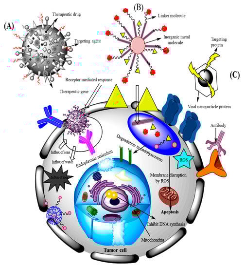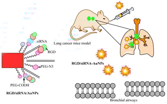 Inorganic nanoparticles including gold, silver, iron oxide and silica nanoparticles have been widely studied as therapeutic agents for cancer treatments in biomedical fields []. Among them, gold nanoparticles are attractive constituents for nanoparticle polymer hybrid materials as they support localized surface plasmon resonances, and the wavelength region of the surface plasmon resonance peak can be adjusted finely through the geometric parameters of the particles [,]. In one study, Heo et al. developed the gold nanoparticles surface-functionalized with PEG, biotin and rhodamine B and linked beta-cyclodextrin (β-CD). The specific interactions of these nanoparticles with cancer cells such as HeLa, A549 and MG63, as well as normal NIH3T3 cells, were evaluated. The authors observed that the modified nanoparticles were more effectively involved with the cancer cells. Confocal laser scanning microscopy (CLSM), fluorescence-activated cell-sorting (FACS) and cell viability analyses showed that the surface functionalized nanoparticles played a significant role in the diagnosis and treatment of the cancer cells, and could be used in theranostic agents []. Guo et al. developed a multifunctional nanocarrier encapsulated with methotrexate via electrostatic interaction between gold nanocluster conjugate chitosan and nucleolin targeting aptamer (AS1411). The in vivo study demonstrated that intravenous administration of nanodrug carrier systems into BALB/c mice caused the accumulation of methotrexate at the tumor site. The results suggested that the developed functionalized system can be applied for an effective delivery for anticancer agents and shows enhanced potential in clinical applications []. João Conde et al. fabricated the gold nanoparticles conjugated with siRNA/RGD and studied in a lung cancer murine model. The RGD treatment showed a significant downregulation followed by tumor growth inhibition and the increased survival of the tumor bearing transgenic mice. The results demonstrated that RGD gold nanoparticles stimulate the delivery by intratracheal application in mice that leads to the suppression of tumor cell proliferation. The enhanced targeted delivery of gold nanoparticles encapsulated with siRNA to cancer cells works towards effective silencing of the oncogene. The study showed gold nanoparticles stimulated the inflammatory and immune responses that can promote the therapeutic effect of the siRNA to reduce the tumor size at very low doses []. The schematic illustration of this study is described in Figure 3, which shows the enhanced efficacy of siRNA loaded into functionalized nanoparticles.