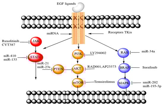 Oncogenic signaling pathways and drugs targeting abnormal signaling of EGFR, VEGFR, PI3/AKT/mTOR, RAS/BRAF/MAK, JAK/STAT pathways. Reproduced from the reference [].