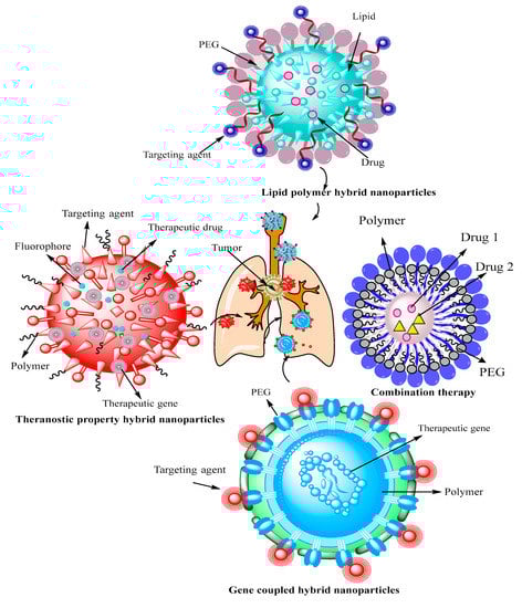 In order to enhance the efficacy of the therapeutic regimen in lung cancer, it is necessary to develop new systems that can increase the survival rates. The development of hybrid nanoparticles (that could comprise both inorganic and organic structural moieties) in conjugation with other genes, biomolecules and other drugs are promising therapeutics systems for efficient targeting []. These types of nanoparticles are important for targeting the tumor site, for its early diagnosis and to measure the risk of malignancy in neighboring cells. These hybrid types are classified into diagnostics, therapeutic and theranostic nanoparticles. Figure 4 graphically shows the different types of hybrid nanoparticles that have been applied for lung cancer targeting.