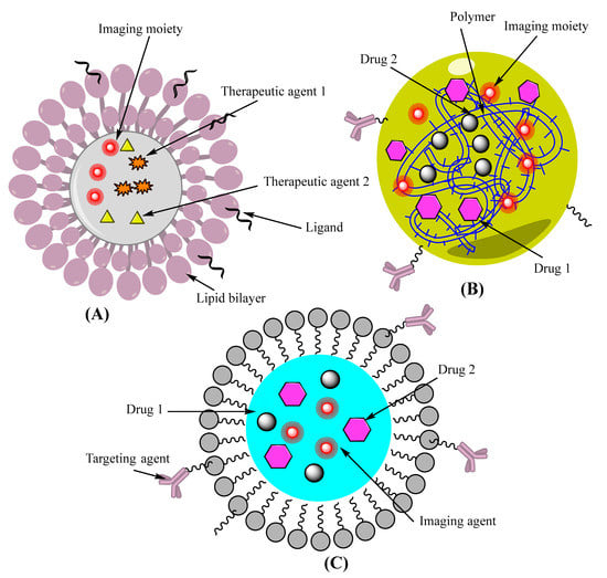 Schematic representation of combination therapy approaches in targeting lung cancer. (A) Combination lipid nanoparticles with imaging and therapeutic moiety (B) Polymer based nanocapsule hybrid therapy with imaging and targeting moiety along with therapeutic agent (C) Inorganic-polymer combination nanoparticle coencapsulated with drug molecule, targeting agent and imaging moiety.