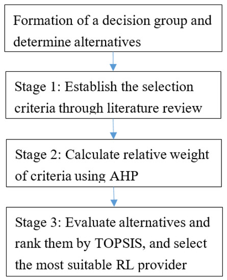 Govindan et al. proposed a two-stage 3PRLP selection model that utilized AHP to identify factors and ANP to select providers [18]. Kumar and Dixit [28] and Liu et al. [29] combined this two-stage model with MCDM and upgraded it to a three-stage approach. This paper applies a three-stage process created through the synthesis of Govindan [18], Kumar and Dixit [28] and Liu et al.’s [29] frameworks for the RL provider selection as shown in Figure 1. In the first stage, the selection criteria for RL providers are determined based on an extensive literature review. In the second stage, AHP is used to calculate the relative weights of criteria. In this stage, the data of rating are collected from social groups through questionnaires via the Internet. In the last stage, the scores of RL providers in all three modes are collected, and then TOPSIS is used to calculate and rank the final scores of each RL provider. The best partner is the one with the highest final score.
