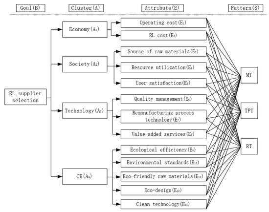 The framework consists of three parts: goal (B), cluster (A) and attribute (E). The goal is RL provider selection. The cluster includes economy (A1), society (A2), technology (A3) and CE (A4). The economic cluster includes attributes covering operating cost (E1) and RL cost (E2). The society cluster includes attributes of source of raw materials (E3), resource utilization (E4) and user satisfaction (E5). The technology cluster includes attributes of quality management (E6), remanufacturing process technology (E7) and value-added services (E8). The CE cluster includes attributes of ecological efficiency (E9), environmental standards (E10), eco-friendly raw materials (E11), eco-design (E12) and clean technology (E13).