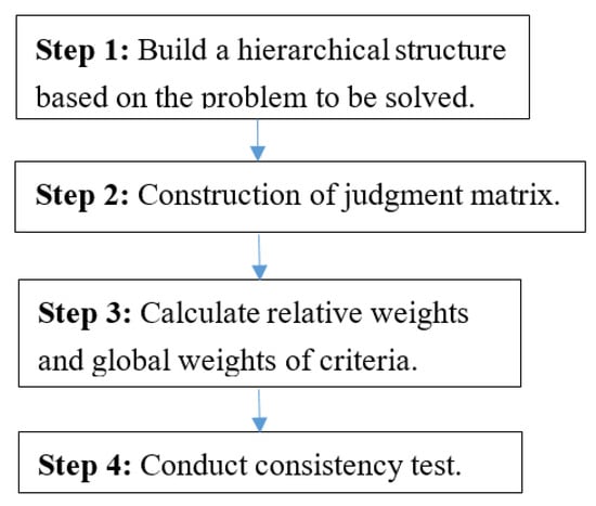 The basic idea of AHP is to hierarchize the problem to be analyzed (Saaty, 1980) [51]. According to the overall goal to be achieved, the problem is decomposed into different influence factors, which are combined in different levels according to their association and relationship to form a multilevel analysis structure model; finally, the alternatives are compared and ranked. The steps of AHP are as follows (Figure 3) [28,51]: