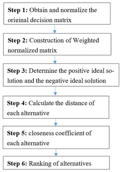 TOPSIS, an analysis method that compares and selects multiple alternatives based on multiple criteria, was firstly proposed by Hwang and Yoon (1981) [52]. Fundamental for TOPSIS is to determine the positive ideal solution and negative ideal solution of each attribute. The positive ideal solution is the optimal solution among the alternatives, and its attribute values reach the best value, while the negative ideal solution is the worst solution. After calculating the Euclidean distance between each scheme, the positive ideal solution, the distance between each scheme and the negative ideal solution, the approximate degree of each alternative to the optimal solution can be obtained, which can be used as the basis for evaluating the merits of the alternatives. The TOPSIS method has many advantages. It has no strict constraints on the data distribution and sample content. It is applicable to the analysis of small samples as well as large systems with multiple evaluation units and indexes. It is flexible and convenient to use and has universal applicability. The steps of TOPSIS are as follows (Figure 4):