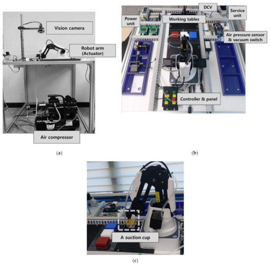 To identify the key machine parameters and test the predictive process adjustment with the corresponding characteristics, a testbed that performs a pick-up operation using a vacuum gripper [27], as depicted in Figure 2 was constructed. Furthermore, the monitoring and control modules were upgraded, as shown in Figure 2b. The detailed information of the system configuration is summarized in Table 2.