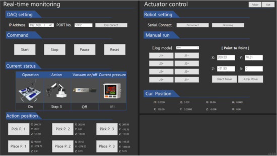 For predictive process adjustment according to real-time operation monitoring, the control modules and the corresponding control software were upgraded, as shown in Figure 3. Due to the upgrade, it was not only possible to acquire sensor signals in real time but also to simultaneously change machine parameters, such as the x-, y-, and z-positions corresponding to the suction start, during the operation. The workflow is as follows: