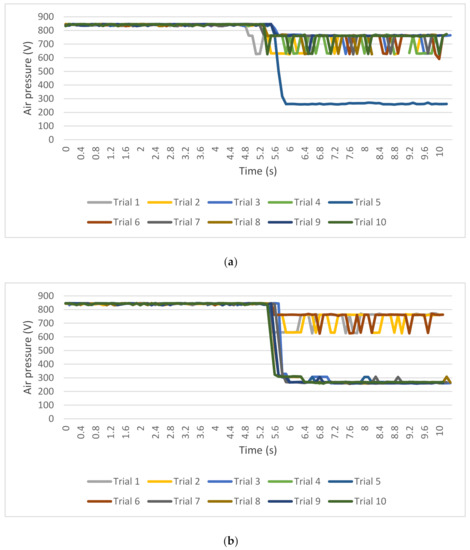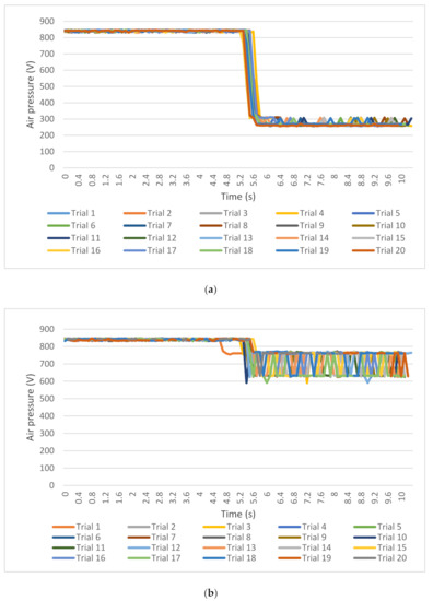 Figure 6a describes the pressure signals of the airflow in the Venturi channel for every lifting iteration. Before starting the suction operation using the vacuum gripper, it was ensured that the initial pressure of the airflow in the Venturi line was almost identical to the original air pressure provided by the air service unit and air compressor. After starting the suction operation (before lifting the object), it can be observed in Figure 6a that the monitored air pressure decreased continuously (at approximately 5.6 to 6.0 s). When the suction was sufficiently succeeded, the decreased pressure was constantly maintained during the rest of the pick-up operation, until moving to the destination position, and the decreased level was identical in the 20 repetitions. Although certain fluctuations in the inlet pressure can be observed during the pick-up operation, the decrease in pressure was mostly constant until the suction operation was terminated. Signal collection automatically stopped after the robotic arm was moved with the vacuum gripper to the destination position and the vacuum switch was turned off to release the object.