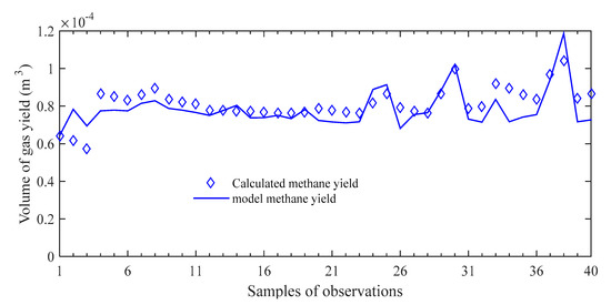 | Observations | Input (x) | Input (Y) | Calculated CH4 (mL/gVS) | Predicted CH4 (mL/gVS) |
