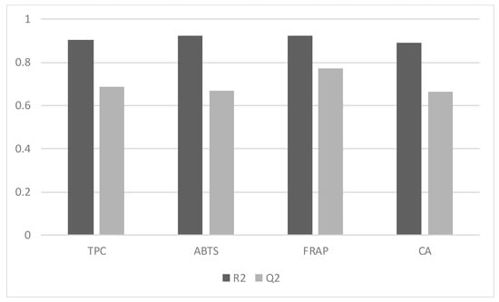 Statistic of the model—R2 and Q2 values of the four responses (TPC, total phenolic content; ABTS, diammonium 2,2′-azino-bis(3-ethylbenzothiazoline-6-sulphonate); FRAP, ferric reducing antioxidant power; CA, chlorogenic acid).