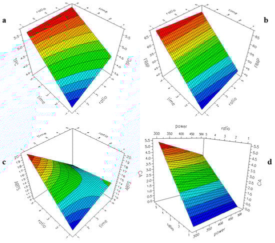 As regards the influence of the different factors, it can be observed from the obtained Equations (1)–(4) that all responses are positively influenced by the X1 factor (weight of herbal material/150 mL of water), while an inverse correlation was found for the X3 factor (microwave power). The X2 factor (time) showed a high positive correlation with TPC, FRAP, and CA. Interesting interactions are represented by ratio × time (inverse correlations except for CA) and L/S ratio × power (positive for TPC and FRAP, negative for ABTS and CA).