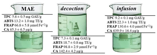 To make a comparison of the phenolic content and in vitro activities of the MAE extract with classic home preparations, infusions and decoctions were prepared and analyzed. Since two grams of L. barbarum leaves were used to prepare infusions and decoctions (150 mL), the prediction function of the software provided the values of TPC, FRAP, ABTS, and CA for a MAE extract from two grams of leaves in 150 mL, irradiated for 5 min at 300 W. Figure 3 shows the values of TPC, FRAP, ABTS, and CA content of L. barbarum leaf extracts obtained by MAE, decoction, and infusion.