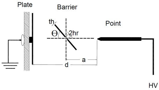 A transformer is a crucial piece of equipment in the power system networks. The transformer’s primary failure comes from the insulating system’s deterioration, which consists of insulating oil and paper [1,2]. The transformer oil remains the most suitable liquid used in high-voltage apparatus as an insulating medium, but it still breaks under electrical and thermal stresses [3,4,5,6,7,8]. In the presence of a barrier in the insulating oil, the risk of the breakdown is reduced due to the stopping of the charge carriers by the barrier; then, these charge carriers accumulate on the barrier surface, constituting the barrier surface charge. Moreover, the barrier plays a significant role in impeding the discharge in the insulating oil of power transformers by encountering particle movement [9]. The breakdown voltage (VBD) of homogeneous and non-homogeneous field gaps is affected mainly by inserting thin dielectric barriers in the gaps; this phenomenon is called the barrier effect. This effect is characterized by the electric field’s uniformity between the barrier and the plane electrode, increasing the VBD. Thus, studying the influence of such barrier effect on the VBD of the transformer oil is essential [10].