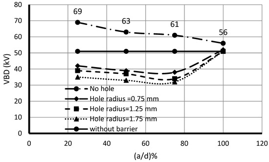 Figure 5 shows that the barrier without any hole significantly affects VBD. With a hole in the barrier, the VBD of the point/plane oil gap decreases. In such a case, the barrier has a negative effect. Meanwhile, an increase in the hole radius leads to a reduction in the VBD at the exact barrier location. When (a/d)% is 100%, the barrier does not affect, and the VBD reaches one of the gaps without the barrier. The experiments are conducted at the barrier thickness th equal to 2 mm, acrylic barrier material, and the inclined angle (θ) equivalent to 90°.