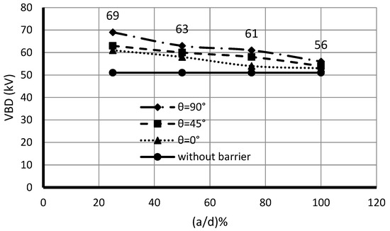 Figure 6 explains the relation between the VBD and the barrier inclined angle (θ). The vertical position (θ = 90°) of the barrier plays an imperative role in increasing the VBD of the power transformer insulating oil rather than any other inclined barrier angle or the barrier with a horizontal position. A decrease in VBD is observed when the location of the barrier increases until (a/d) reaches 100%. Then, the effect of the barrier decreases, and the VBD becomes close to that of the gap without barrier. The experiments’ parameters are an acrylic barrier made of acrylic, without a hole in the barrier, and the barrier thickness (th) of 2 mm.