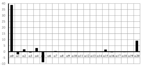 Figure 7 shows αi magnitude of the 2-order equation (Equation (4)) for every input variable. In the statistical section, the significant terms of Equation (4) will be identified and their influence on the response value (VBD). Equation (4) is applicable only for the electrode configuration point/plane gap and not for point/point or plane/plane gap.
