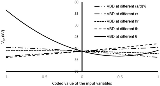 The authors of [42] presented only the fundamentals, advantages, and limitations of the BBD for the optimization of analytical methods. They showed an example for three parameters only with 15 experiments runs where CP0 is three. A total of 46 experiment runs are required according to Equation (2) with six points in the center values of the five variables to apply the BBD to the designed experiments to investigate the effect of five variables on the response of these experiments (VBD). Table 3 illustrates the coded values, the values of the variables, and the response of the 46 experiments. A total of six points are repeated at the zero code of the variables to provide a CP0-1 degree of freedom for determining the experiment errors and enhancing the response’s precision at these zero codes of the variables [43]. A total of 46 experiment runs are conducted to investigate the effect of the previous barrier variables on the VBD, as the BBD technique’s requirement is illustrated in Table 3. Each experiment run is performed to satisfy the particular need of BBD. The first experiment run in Table 3 indicates that the VBD is measured at the following conditions: the barrier location is minimum at 25% of the gap space, the dielectric strength (εr) is minimum at 2.5 for mica barrier material, the radius of the hole in the barrier is at the mean value of 1.25 mm, the barrier thickness is at 3 mm as a mean value of the thickness variable, and the inclined angle of the barrier is at a mean value of 45°. The remaining 46 experiment runs are conducted as illustrated in Table 3.