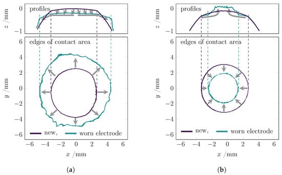 The main geometric parameters to describe and assess electrode wear are shown in Figure 7. For simplicity, the spherical radius of the contact area was neglected. Parameters were also selected by Zhang et al. [], who measured axial wear or length change by the servo gun movement. In this paper, movement of the upper and of the lower electrode was measured by laser-triangulation sensors attached to the welding gun for each electrode. In addition, was determined by 3D topographical measurements. To distinguish between the two measurement concepts for , the following nomenclature was chosen: