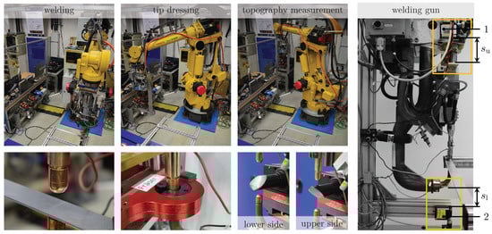 The experiment setup was a configuration of three individual modules interacting with each other. The first module was the welding gun installed on a six axis industrial robot (Figure 4), the second module was the tip dresser, and the third was a chromatic confocal microscope. The robot could move the welding gun to the tip dresser and directly into the measuring range of the microscope. The latter made it possible to measure the 3-dimensional (3D, x–y plane, height z) topographies of both electrodes while being installed on the welding gun. For this purpose, the microscope was equipped with a special rotating measuring head. This unique experiment setup allowed for the continuous wear assessment of the electrodes. Figure 4 shows the robot in all three positions for welding, tip-dressing, and topographical measurements.
