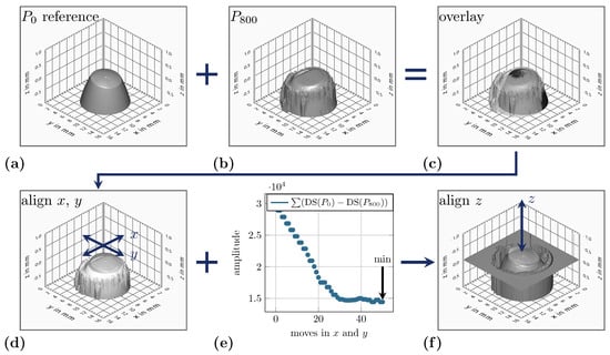 Procedure to align data sets (DSs) of 3D topographical measurements for comparison and determining on example of MC01–TS01 and as 3D projection. (a) Plot of reference DS of ; (b) plot of DS to align; (c) overlay of both DSs; (d,e) aligned DS in x–y plane by determining minimal difference between two DSs; (f) aligned in z direction.
