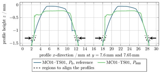 Exemplary comparison of selected profiles derived from topographical measurements of MC01–TS01 and with marked regions to align profiles.