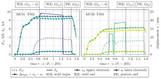 Exemplary process parameters of spot-weld of MC01–TS01 and MC02–TS01 with marked timing positions weld begin (WB), weld end (WE), and process end (PE) for further evaluations.