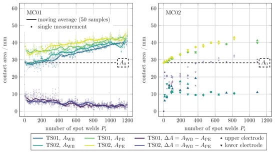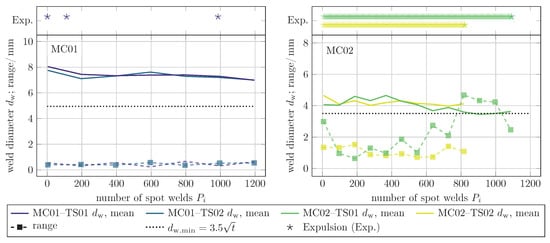 Measured weld diameters after DT over the number of spot welds decreased slightly for both MC (Figure 11). While of MC01 showed little variation with a small range, strongly fluctuated at the beginning and from around 400 spot welds of MC02. Looking at the occurrence of weld expulsions, MC01 and MC02 showed huge differences. Whereas nearly no expulsions occurred in MC01, they appear in almost every weld of MC02 at the sheet interface.