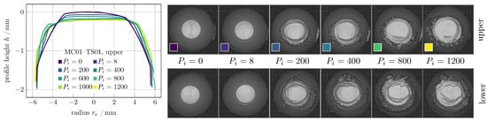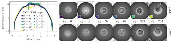 Figure 12 and Figure 13 show profile sections and selected 3D topographical measurements of the electrodes of the respective TS01 at different stages. In both figures, the images of show the electrodes right after tip dressing. The wear caused by the progressive change in the contact surface can clearly be seen with the increasing number of spot welds. In MC01, an enlargement of the electrode contact area can be seen in the radial direction. According to [,], the radial widening of electrodes leads to axial wear due to the law of constant volume. Crater formation can also be observed on the surfaces, especially at the upper electrode at and . Local melting or breaking out of the brittle alloy layer, which is known as pitting [], forms these craters. Coating materials with a low melting temperature such as zinc () can penetrate these craters and come into contact with the electrode material again. Mechanical stresses and the weld current flow are concentrated in the edge area of the crater, which can lead to accelerated material removal and crater growth. Besides this, the top view of the electrodes also shows a slight plateau. This is not comparable to the wear mode of plateau formation. In fact, this can be called trimming as the length of the electrode decreases []. In MC02, the distinctive plateau formation occurred after just a few welds. With a higher numbers of welds, the plateau increasingly moves out of the center of the electrode in the direction of the opening of the welding gun, which might be because of the elastic bending of the welding gun. Comparing the two figures, the 3D topographical measurements revealed a clear difference between the two wear modes. Mushrooming can be observed at MC01 (Figure 12) and plateau forming at MC02 (Figure 13). Both figures show symmetrical wear of the upper and lower electrodes, as assumed before. The flanks of the profile sections were not aligned one above the other as described in Section 2.4.1 in both figures. This is due to the calculation of the profile sections. Each section is the mean course of 36 individual profile sections rotating around the center of electrode with angular spacing of .