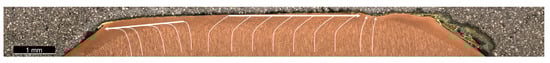 The radial flow and loss of material from the electrode surface caused the electrodes to decrease in length. Figure 14 shows a cross-section of the anode of MC01–TS01 after 1200 spot welds. The etched structure shows material flow in the radial direction near the electrode surface. Furthermore, material deposits can be seen at the edge of the electrode. Loss of material is caused by the formation and destruction of alloy layers [].
